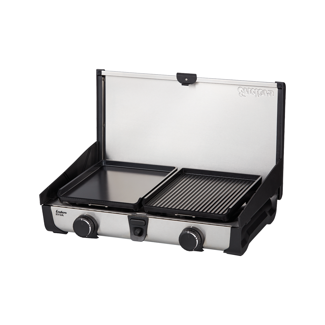 KÜCHENKOMFORT TRIFFT FREIHEIT Die neue RYDA-Serie bietet ausgezeichnete Leistung für Camping-Enthusiasten. Mit zwei leistungsstarken, stufenlos regulierbaren Brennern, Zündsicherung und Piezo-Zündung bist du stets bereit für kulinarische Highlights unter freiem Himmel. Die beiden Grillplatten ermöglichen es dir optional, eine Vielzahl von Gerichten zuzubereiten – von saftigen Steaks bis hin zu gegrilltem Gemüse. Das robuste Edelstahlgehäuse und die stabilen Topfständer garantieren höchste Langlebigkeit. Dank der durchdachten Schlauchhalterung und dem praktischen Verschluss wird der Transport zum Kinderspiel. Ein Überlaufschutz und Windschutz machen die RYDA-Kocher zur idealen Wahl für jedes Outdoor-Abenteuer.