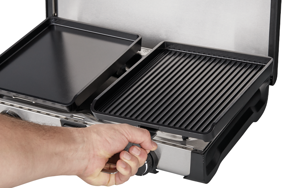 zusätzliche Kochmöglichkeit dank zwei zusätzlicher Grillplatten (1x glatt, 1x gerippt) mit spezieller Keramikbeschichtung